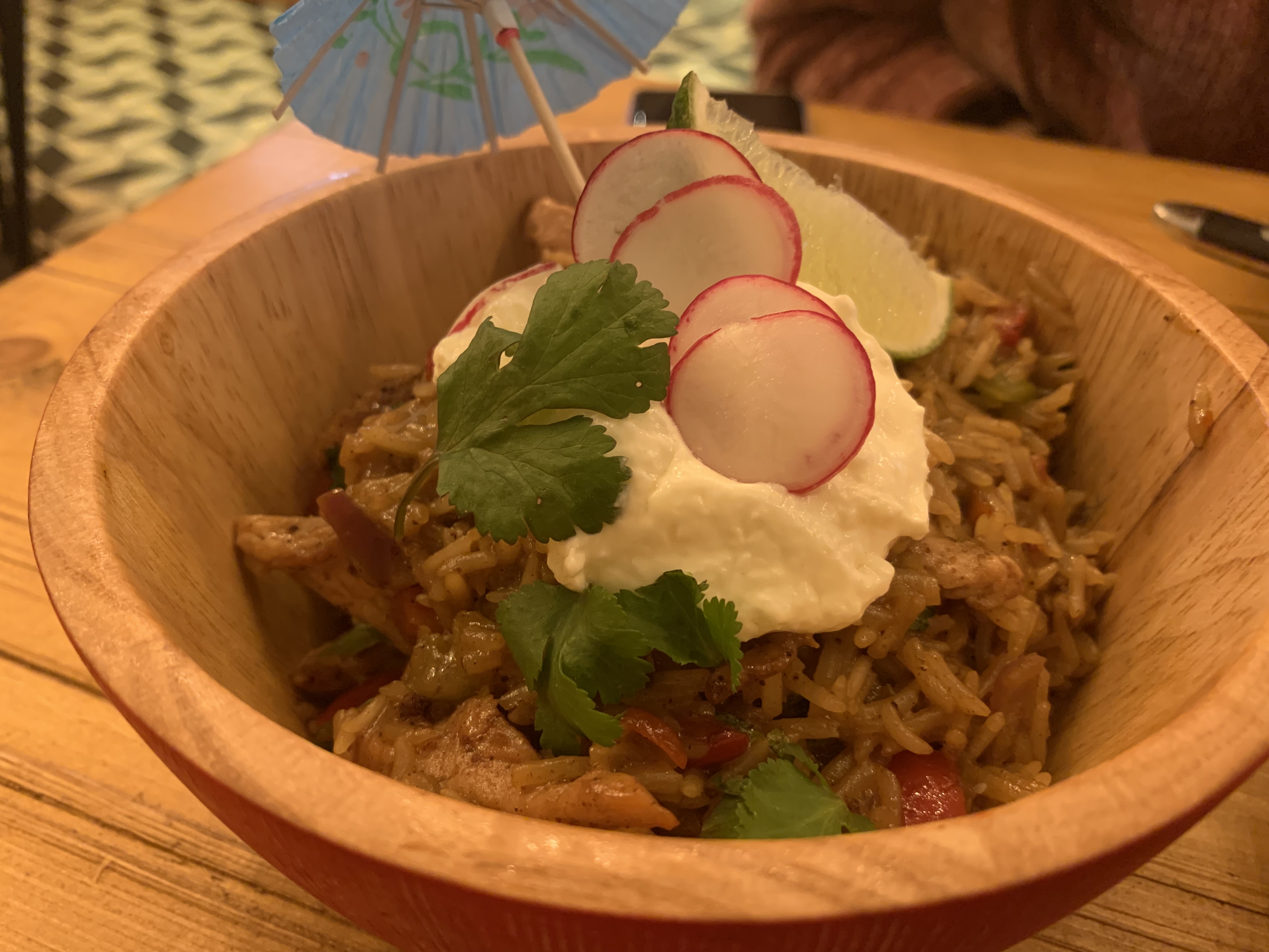 Αμέσως μετά ήρθε το Jamaican Fried Rice. Τηγανητό ρύζι σε φύλλα μπανάνας, μιξ λαχανικών, κάρυ, γάλα καρύδας και μπορείς να προσθέσεις κοτόπουλο, έτσι όπως σερβιρίστηκε σε εμάς. Ήταν νόστιμο, είχε αρκετό κοτόπουλο και για main course είναι αρκετά χορταστικό.